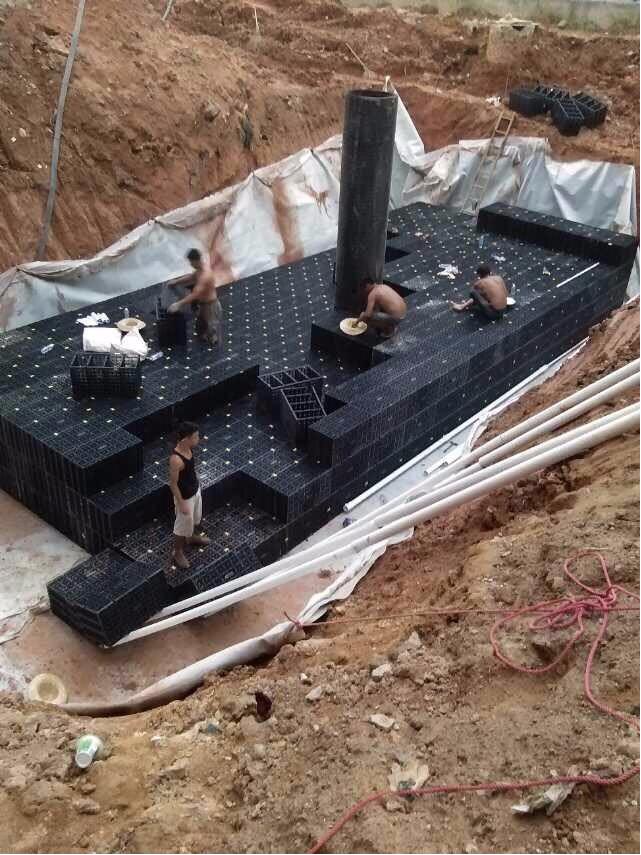 雨水蓄水模塊安裝的流程:基礎處理→土工布、土工膜鋪裝→模塊的定位與碼放→管道與模塊的連接→基礎回填及夯實→成品保護。